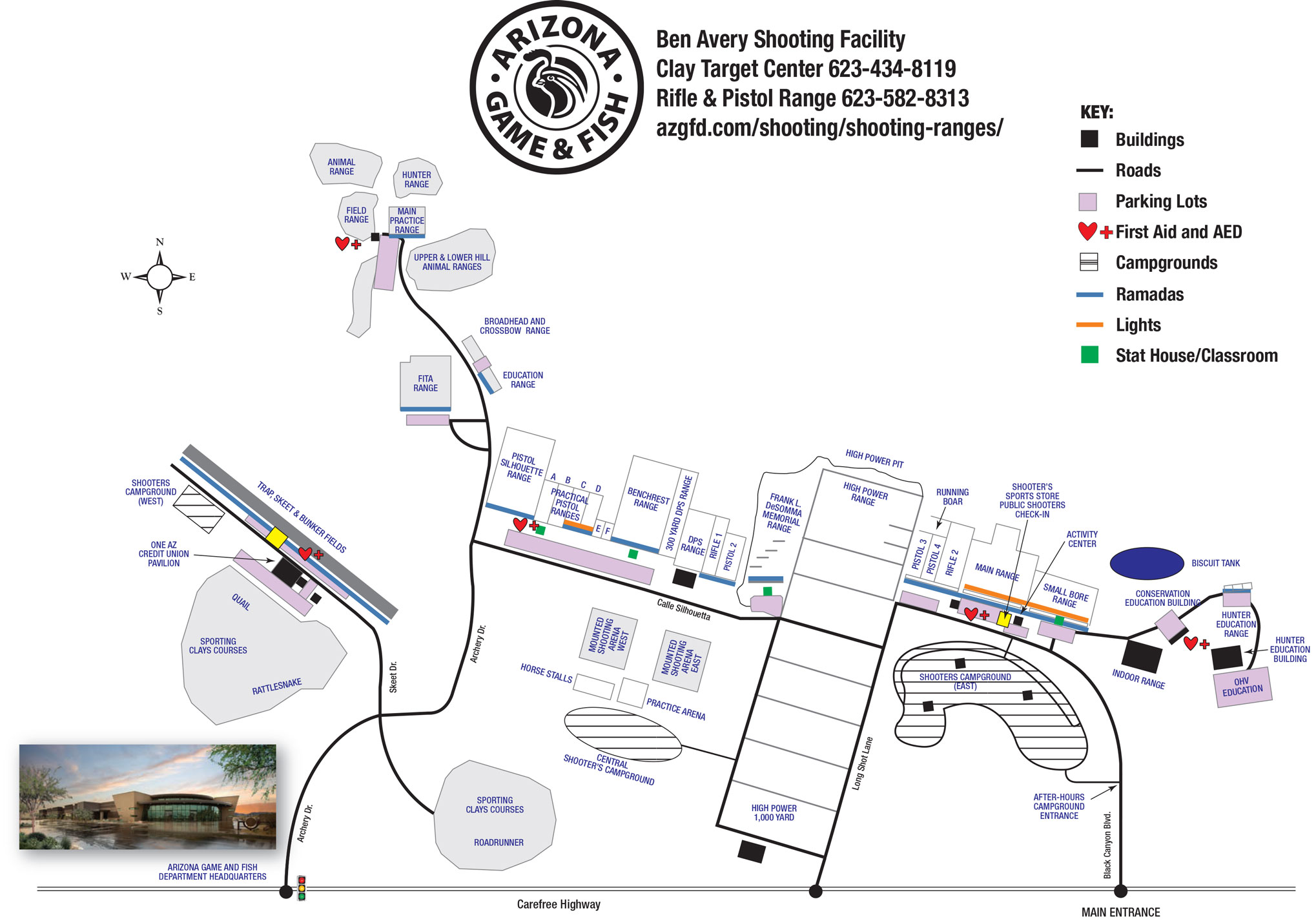 Facilities map including rifle & pistol, clay target center and archery ranges